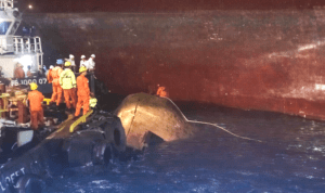 Kecelakaan tersebut telah ditangani pihak Kepolisian dan petugas Tol Permai. Tampak petugas tengah melakukan evakuasi muatan dengan memindahkan ke truk box lain.