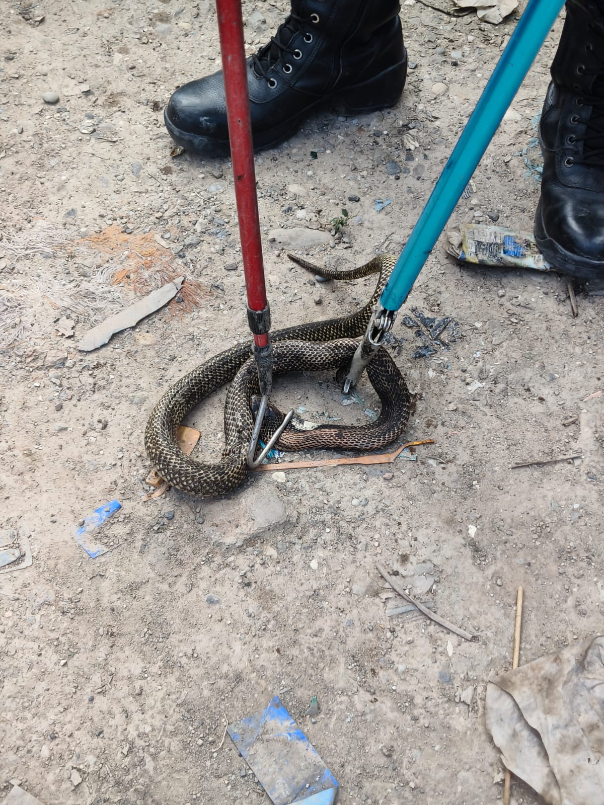 Setelah beberapa menit proses evakuasi, ular kobra yang masih berukuran sedang berhasil ditangkap dan diamankan.***(ant)